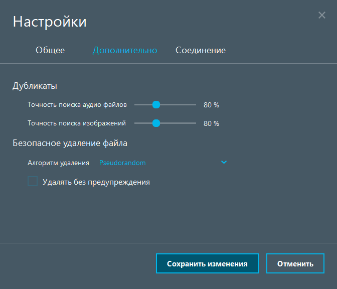У вкладці «Додатково», у розділі «Дублікати» можна вибрати точність пошуку дублікатів аудіо файлів та зображень, а в розділі «Безпечне видалення файлу» виберіть відповідний алгоритм видалення. Також ви можете відразу видаляти файли без попередження, але цей параметр не рекомендується.