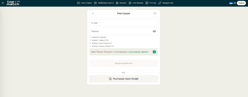 На головній сторінці сайту або в додатку знайдіть кнопку Реєстрація TopMatch або «Створити акаунт» і натисніть на неї.